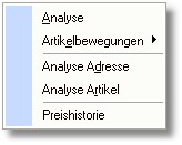 In der Tabelle "Adress/Artikel" können Sie eine Kondition (Adress/Artikelverbindung) suchen und über den Button <Auswertung> oder mit der Taste [RETURN] öffnet sich ein Popup-Menü mit folgenden Analysemöglichkeiten: