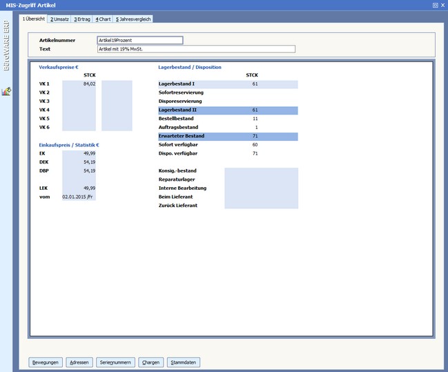 In der ersten Informationskarteikarte werden - neben anderen Stamminformationen - die Verkaufspreise sowie die einzelnen Einkaufspreise des Artikels angezeigt. Im Bereich "Lagerbestände" können Sie die aktuell verfügbaren und erwarteten Mengen des Artikels einsehen.