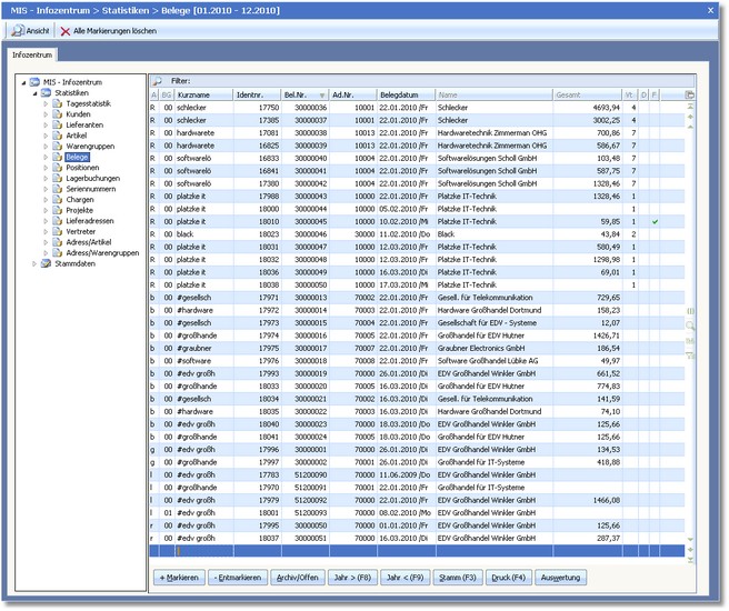 Nach Auswahl des MIS-Bereiches öffnet sich zunächst eine vorgelagerte Auswahltabelle, in der alle Belege tabellarisch angezeigt werden. Über die Baumauswahl kann in die einzelnen Belegarten verzweigt werden. Innerhalb dieser Auswahltabelle sind die beschriebenen Such- und Sortierfunktionen aktiv.