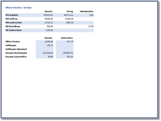 Die erste Informationsmaske zeigt im Bereich "Offene Umsätze/Erträge" die Betragswerte der einzelnen Belegarten des Wareneingangs und Warenausgangs.