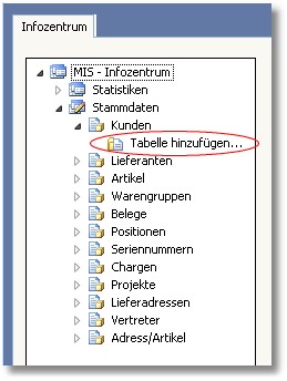 3. Über den Ast "Tabelle hinzufügen" erstellt das Programm automatisch einen Vorgabedialog (Maske, Tabelle, Karteikarten), den Sie sehr leicht über verschiedene Einstellmöglichkeiten an seine Bedürfnisse anpassen können. Die neu erstellte Tabelle wird automatisch in die Baumnavigation des Informationszentrums eingefügt und kann dann verwendet werden.