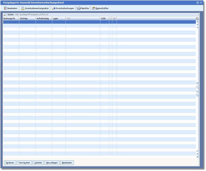 Das Programm öffnet die vorgelagerte Auswahl Inventurvorbuchungsdatei, die zunächst noch leer ist.