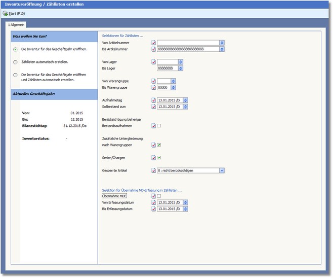 Das Programm öffnet den Dialog "Inventureröffnung/Zähllisten erstellen".