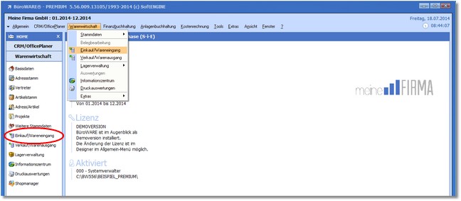 1. Verlassen Sie den Bearbeitungsdialog des Bestellvorschlags und wählen Sie im Hauptmenü: „Warenwirtschaft > Einkauf/Wareneingang".