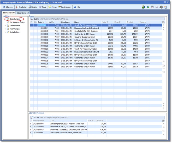 Das Programm öffnet die vorgelagerte Auswahltabelle der Bestellungen. 2. Klicken Sie mit der Maus im Verzeichnisbaum auf die Selektion "Bestellungen".