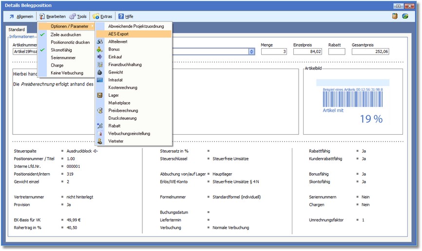 So können Sie die Einstellungen für den AES-Export in den Positionsdaten festlegen: