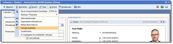 wechseln Sie mit [RETURN] in die Adressbearbeitung und wählen Sie dort den Menüpunkt "Bearbeiten > Verträge bearbeiten".