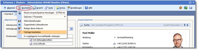 2. Über den Menüpunkt "Bearbeiten" wählen Sie "Verträge bearbeiten".