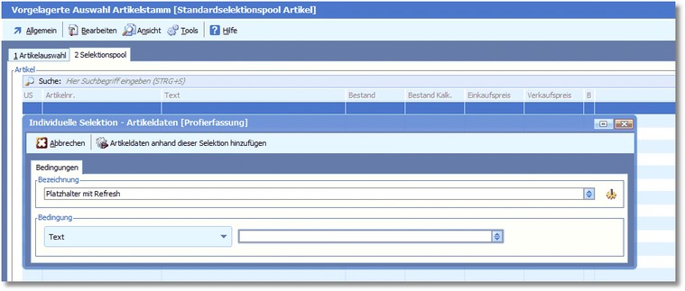 << Hier KLicken um eine Inhaltsübersicht anzuzeigen >> Navigation: Warenwirtschaft > Selektionspools > Neuerungen Selektionspool > Profierfassung > Platzhalter > Platzhalter mit Refresh |