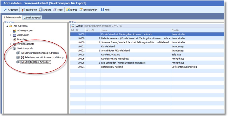Wenn man in der Adressauswahl im Baum auf einem bestimmten Selektionspool-Ast steht und in die Kartei "Selektionspool" wechselt, steht man automatisch in jenem Pool und kann ggf. sofort diverse Prozesse anstoßen.