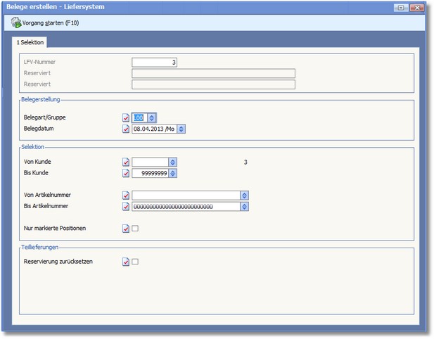 3. Grenzen Sie die Belege, deren Artikel zur Lieferung vorgeschlagen werden sollen, mittels folgender Selektionsparameter ein: