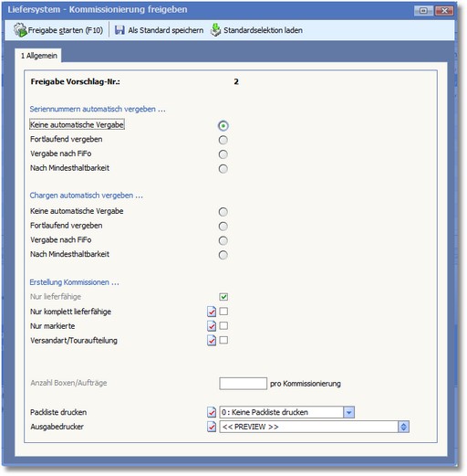 2. Legen Sie die gewünschten Parameter fest und starten Sie die Freigabe des Liefervorschlags zur Kommissionierung mit [F10].