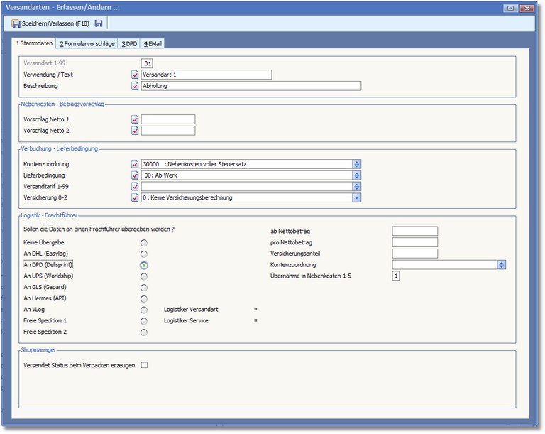 << Hier KLicken um eine Inhaltsübersicht anzuzeigen >> Navigation: Warenwirtschaft > Lagerverwaltung > Lager-/Logistikcenter > Verpacken/Logistiker > Versandart |